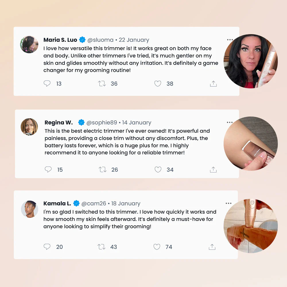Meet the AuraVita All-in-One Trimmer. We've reimagined hair removal around one simple principle: your comfort comes first. Our patented skin-friendly technology gives you salon-smooth results without the pain, irritation, or recovery time.